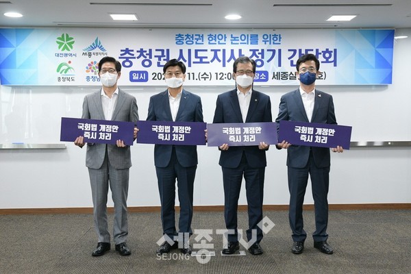 이춘희 세종특별자치시장을 비롯한 충청권 4개 시도지사가 11일 세종시청 대회의실에서 열린 간담회에 참석, 9월 정기국회 이전 국회법 개정안 처리에 한목소리를 냈다.
