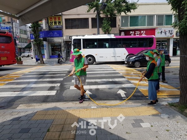 이날 조치원읍은 세종시 자율방재단원과 합동으로 뜨겁게 달궈진 횡단보도, 인도에 살수차를 이용한 물 뿌리기, 폭염대비 국민행동요령 홍보 및 생수, 얼음팩등 폭염 예방물품 지원 등의 활동을 실시했다.