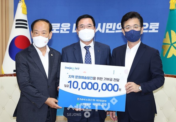 허태정 대전시장은 17일 대전시청에서 NH농협은행 대전영업 본부와 지역 문화예술 발전과 활성화를 위한 기부금 전달식을 가졌다.