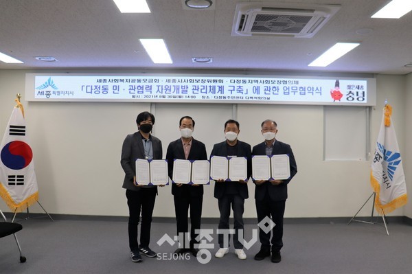 세종특별자치시 다정동 지역사회보장협의체(공동위원장 김광엽·김학준)가 지난 30일 다정동주민센터에서 세종사회복지공동모금회, 세종시사회보장위원회와 연합모금을 위한 업무협약을 체결했다.