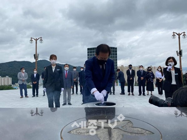 국민의힘 홍준표 예비후보는 9월 3일 jp 희망로드 11일차 일정으로 경남을 방문, 첫 행선지로 마산 국립 3.15 민주묘지를 참배했다.