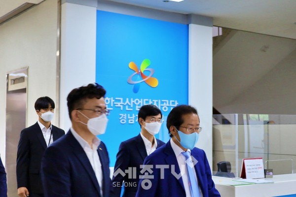 창원으로 이동한 홍준표 예비후보는 11시 30분경 한국산업단지공단 경남지역본부를 방문했다. 국립산업단지는 홍 예비후보가 경남도지사 시절 국가의 승인을 받아 유치한 사업이다.