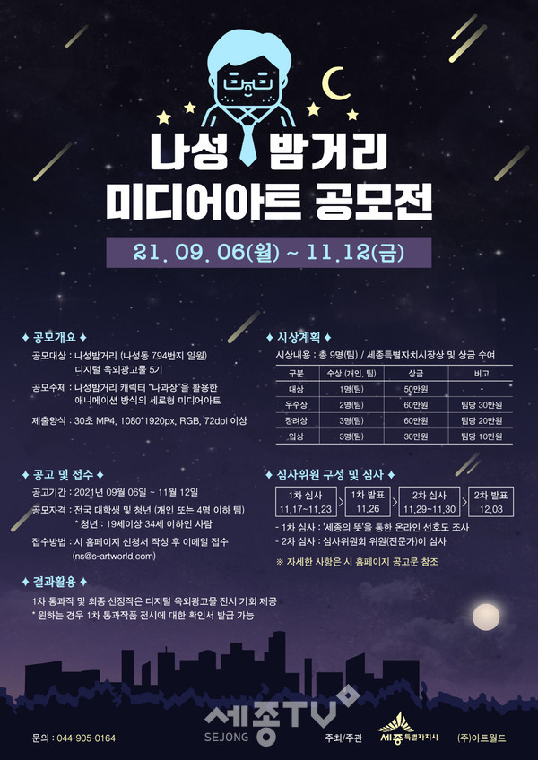 세종특별자치시(시장 이춘희)가 나성동 중심상업지역을 칭하는 나성밤거리의 캐릭터 ‘나과장’을 이용한 미디어아트 콘텐츠를 오는 11월 12일까지 공모한다.