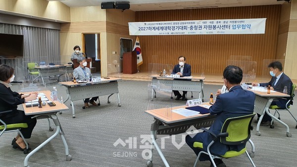 ㈔2027하계유니버시아드대회 충청권 공동유치위원회(사무총장 김윤석)가 13일 세종시지방자치회관에서 충청권자원봉사센터(세종·대전·충북·충남)와 손을 잡고 U대회 유치·운영에 대해 상호 협력한다.