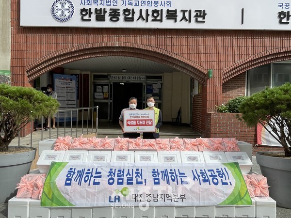 LH 대전충남지역본부(송진선 본부장)은 9월 14일(화) 추석명절을 맞이해 지역 내 저소득 아동 30가정, 고연령층 70가정을 대상으로 식자재키트(297만원 상당) 후원물품 전달식을 한밭종합사회복지관(오명근 관장)에서 가졌다.