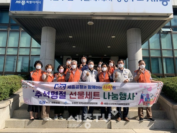 KCC세종공장이 추석명절을 앞두고 취약계층 지원을 위해 16일 세종특별자치시 소정면지역사회보장협의체(공동위원장 신을재·김한식)를 찾아 총 500만 원 상당의 한우선물세트를 전달했다.