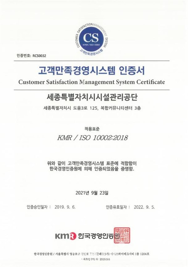 세종특별자치시시설관리공단(이사장 계용준, 이하 공단)은 ISO10002(고객만족경영시스템) 인증 유지를 위한 사후심사에서 적합 판정을 받았다고 23일 밝혔다.