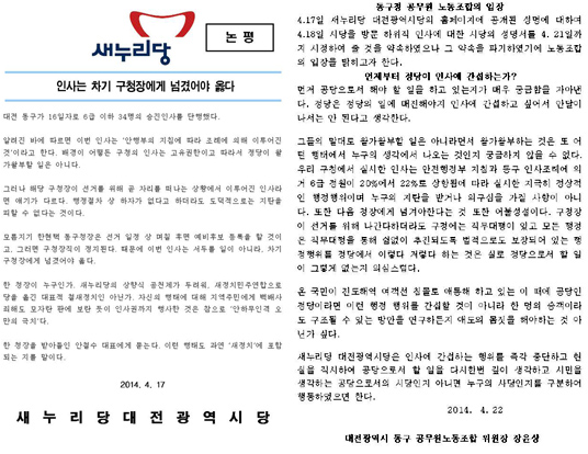 새누리당 대전시당은 동구청이 지난 16일자로 6급 이하 34명의 승진인사를 단행하자 '해당 구청장이 선거를 위해 곧 자리를 떠나는 상황에서 이루어진 인사로 행정절차상 하자가 없다고 하더라도 도덕적으로 지탄을 피할 수 없다"며 "이번 인사는 서두를 일이 아니라 차기 구청장에게 넘겼어야 옳다'는 논평을 내놓았다.
