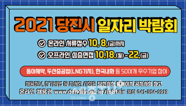 이번 박람회에 참여를 원하는 구직자는 다음달 8일까지 온라인채용관(www.dangjin.go.kr/jobfair)을 통해 채용정보를 확인한 후 이메일(job1918@korea.kr)로 접수하면 된다.