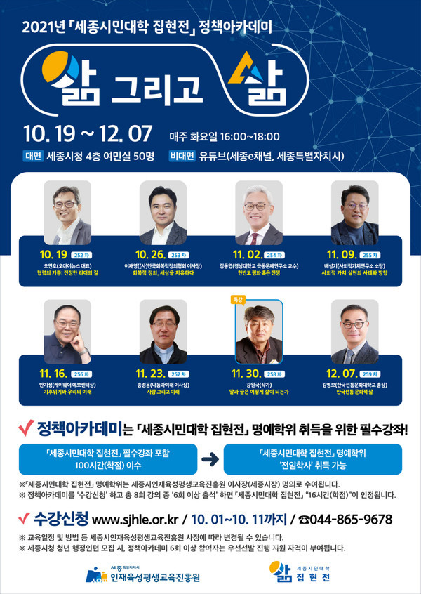 세종시인재육성평생교육진흥원(원장 박영송)이 운영하는 정책아카데미 ‘앎 그리고 삶’ 강좌는 ‘세종시민대학 집현전’의 명예학위 취득을 위한 필수강좌이다.