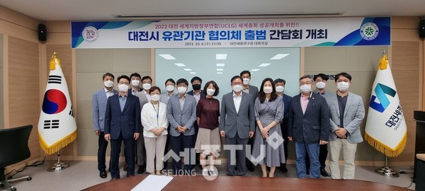 2022대전세계지방정부연합(UCLG)총회 조직위원회(위원장 허태정)는 2022년 대전총회의 성공 개최를 위해 6일 대전시 14개 유관기관 실(단)장 들이 한자리에 모여 유관기관 협의체 출범하고 간담회를 개최했다고 밝혔다.