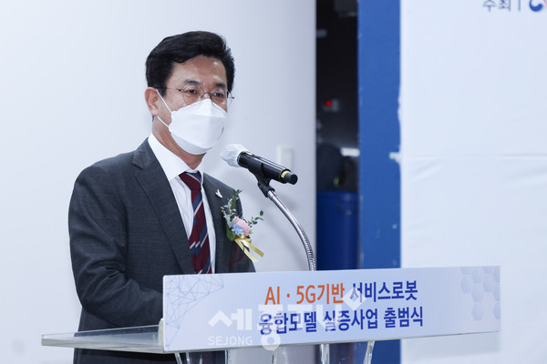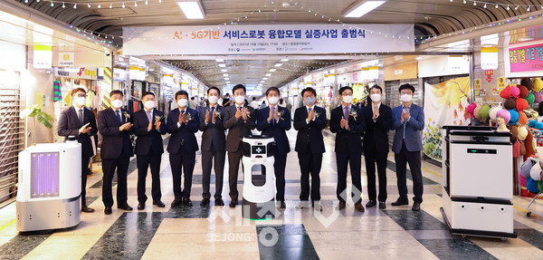 허태정 대전시장과 산업통상자원부 주영준 산업정책실장은 13일 오후, 대전 중앙로 지하상가(대전시 선화동)에서 지역상인들, 로봇기업 및 지역 국회의원, 유관기관이 참여한 가운데 열린 ‘AI·5G기반 서비스로봇 융합모델 실증사업 출범식’에 참석했다.