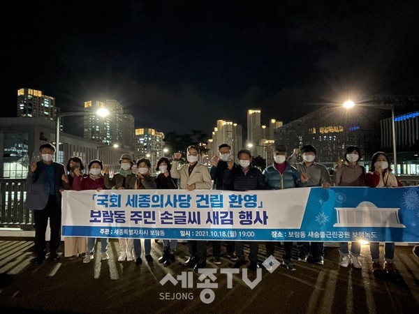 세종특별자치시 보람동(동장 강민규)이 18일 보람동 보행녹도 LED화분 일대에서 국회 세종의사당 건립 확정을 기념해 ‘보람동 주민 손글씨 새김 행사’를 진행했다.