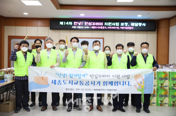 세종도시교통공사(사장 배준석)는 지난 13일 (사)세종특별자치시자원봉사센터(센터장 임명옥)에서 추진하고 있는 “안녕 함께할게” 안심꾸러미 14차 지원사업에 참여해 이웃들이 따뜻한 겨울을 날 수 있도록 봉사활동을 함께했다.