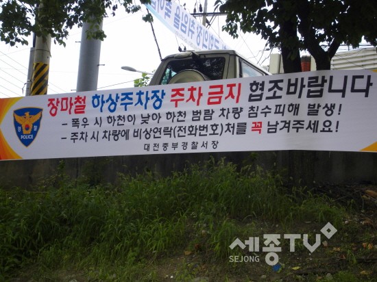 중부경찰서는 30일 장마철 및 집중호우 시 잦은 침수로 주차차량의 피해가 많은 중구 문창교 밑 하상주차장에 우천 시 주차금지를 협조하는 현수막을 설치하고 비 피해 예방활동에 나섰다.