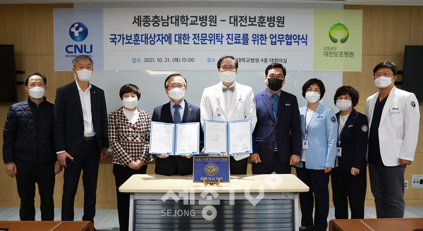 세종충남대학교병원(원장 나용길)은 10월 21일(목) 4층 대회의실에서 대전보훈병원(원장 송시헌)과 국가보훈대상자 전문위탁 진료병원 및 진료협력병원 업무협약을 체결했다.