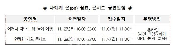 이번 공연은 문화체육관광부가 주최하고 한국도서관문화진흥원이 주관하는 2021년 공공도서관 문화가 있는 날 공모 사업에 선정되어 진행하는 행사로 ▲11월 27일 (토) 어쩌다 떠난 여행과 함께 모든 세대가 함께 부르고 즐길 수 있는 동요 메들리 공연 ▲11월 28일(토) ‘사람이 꽃보다 아름다워’,‘소금인형’ 등으로 유명한 싱어송라이터 안치환의 노래와 통기타가 어우러지는 가요 콘서트를 진행한다.