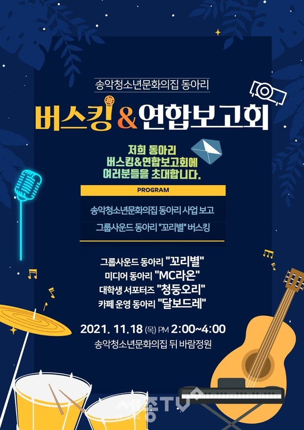 이날 공연에는 송악청소년문화의집 그룹사운드 동아리 ‘꼬리별’을 포함해 함께 운영하고 있는 카페 동아리 ‘달보드레’, 미디어 동아리 ‘MC라온’, 대학생 서포터즈 동아리 ‘청둥오리’의 연간 운영 내용에 대한 보고회가 함께 진행해 청소년들에게 다양한 동아리를 알리고 참여할 수 있도록 지원할 예정이다.