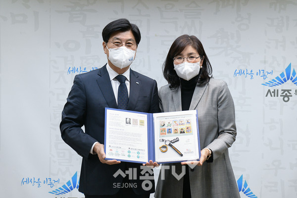 이춘희 세종특별자치시장이 22일 시청 접견실에서 대한결핵협회 충남세종대전지부 남상현 회장과 관계자들이 참석한 가운데 크리스마스 씰 성금을 전달했다.