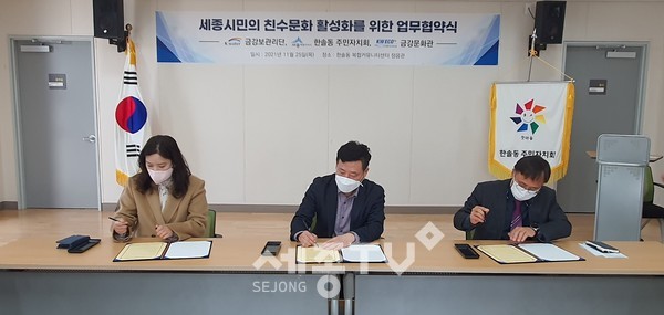 세종특별자치시 한솔동 주민자치회(회장 박순영)가 세종시민의 친수문화 향유를 위해 지난 25일 한국수자원공사 금강보관리단, 수자원환경산업진흥㈜ 금강문화관과 상호교류 업무협약을 체결했다.