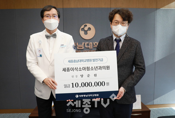 세종충남대학교병원(원장 나용길)은 12월 7일(화) 세종이삭소아청소년과의원 양준원 대표원장으로부터 발전후원금 1000만원을 전달받았다.
