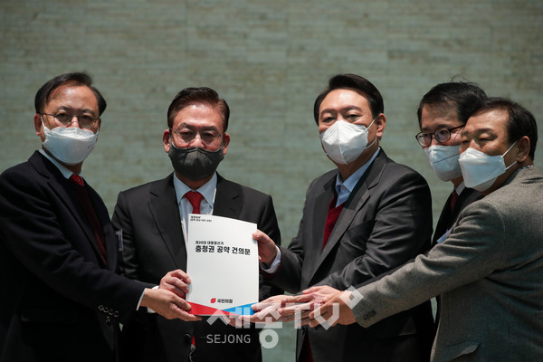 국민의힘 충청권 시·도당(대전,세종,충북,충남) 위원장은 12월8일(수) 10시 공군호텔 그랜드볼륨에서 ‘제20대 대통령선거 충청권 공약 건의문’을 윤석열 후보에게 전달했다.