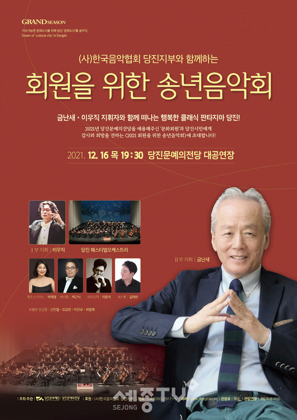 당진문화재단 관계자는 “탈도 많고 어려움도 있었던 한 해였지만, 일상 속의 문화예술을 회원과 시민 여러분과 함께 누릴 수 있어서 행복했고, 감사드린다”며, 재단과 지역 예술인들이 마음을 모아 준비한 송년 맞이 고품격의 공연을 통해 치유되고 새로운 힘을 얻는 기회가 되기를 바란다고 전했다.