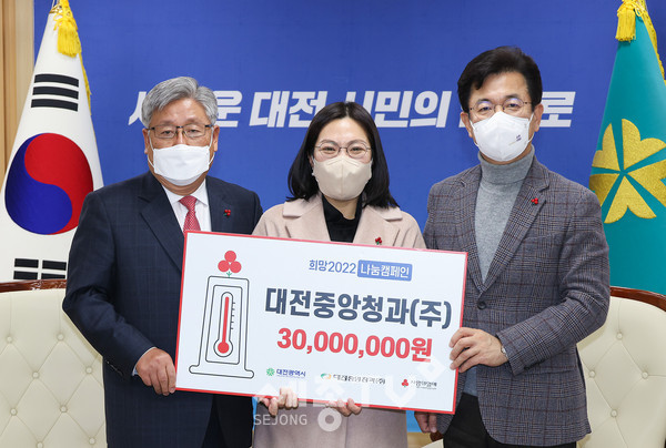대전중앙청과(주)는 24일 시청 응접실을 찾아 어려운 이웃의 따뜻한 겨울나기를 위한 사랑의 성금 3,000만 원을 사랑의열매에 기탁했다.