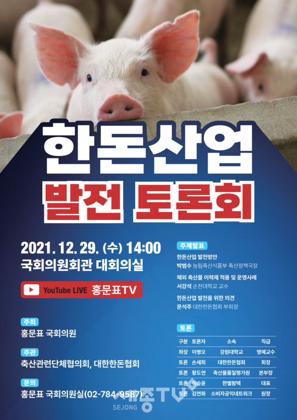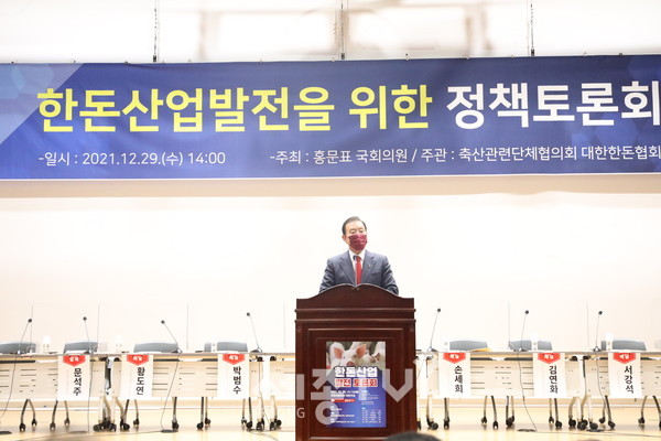 국민의힘 홍문표 국회의원(충남 예산․홍성)이 주최하고 대한한돈협회(회장 손세희)와 축산관련단체협의회(회장 이승호)가 주관하는 ‘한돈산업 발전 토론회’가 12월 29일 국회의원회관 대회의실에서 개최했다.