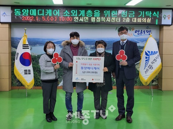 연서면 쌍전리에서 섬유제품을 제조하는 동양메디케어(대표 정경자)는 5일 연서면을 찾아 어려운 이웃을 위해 써달라며 성금 300만 원을 기탁했다.