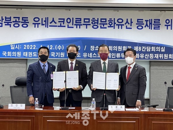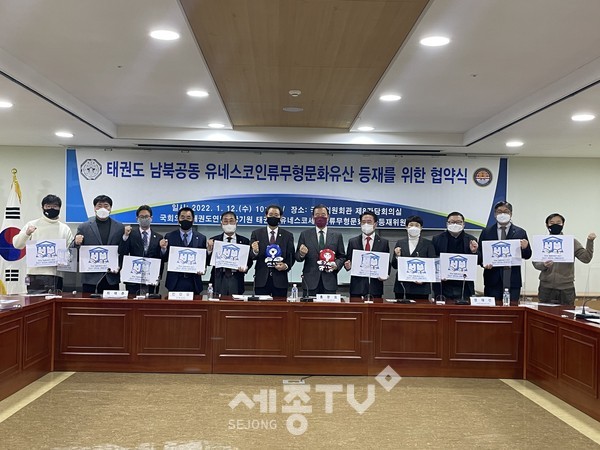 21대 국회의원 태권도연맹 총재를 맡고 있는 홍문표 국회의원(충남 예산‧홍성)은 1월 12일 국회의원회관 제8간담회의실에서 국기원 태권도 남북 공동 유네스코 등재 추진위원회(이하 ‘추진위’)와 태권도의 남북 공동 세계인류무형문화유산 등재를 위한 업무협약식을 가졌다.