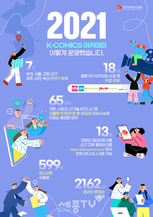 2021년 5월부터 12월까지 8개월간 운영된 ‘2021 K-Comics 아카데미’는 총 65강좌 526시수에 이르는 정규 교육과 신규 동영상 강좌 13종을 개발하며 양질의 만화·웹툰 분야의 교육과정을 무료로 제공했다.
