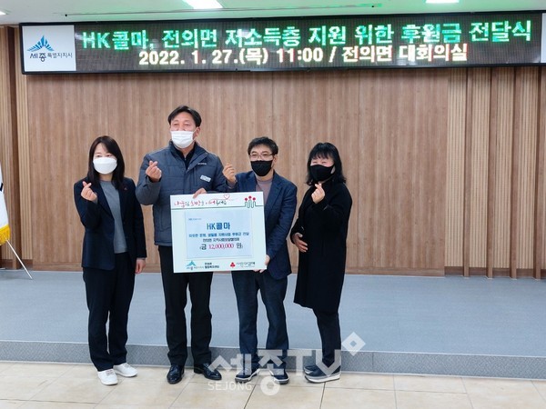 이날 후원금 전달식에는 이영주 한국콜마 생산본부장, 이은일 전의면장, 윤혜란 전의면지역사회보장협의체 민간위원장이 참석했다.