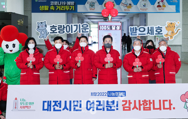 3일 오전 10시 시청 1층에서 지난해 12월 1일부터 올해 1월 31일까지 총 62일간 진행된 희망2022 나눔캠페인 폐막식 행사가 열렸다. 이날 행사에는 허태정 대전시장, 권중순 대전시의장, 정태희 대전사회복지공동모금회장 등이 함께 했다.