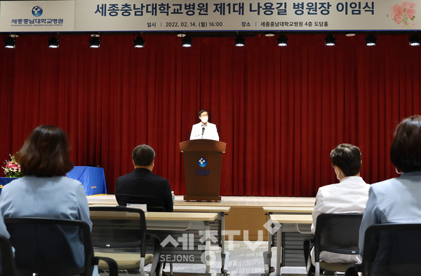 세종충남대학교병원은 2월 14일(월) 오후 4시 도담홀(대강당)에서 충남대학교병원 본원 윤환중 원장과 정현태 상임감사 등 주요 보직자가 참석한 가운데 나용길 초대 원장의 이임식을 개최했다.