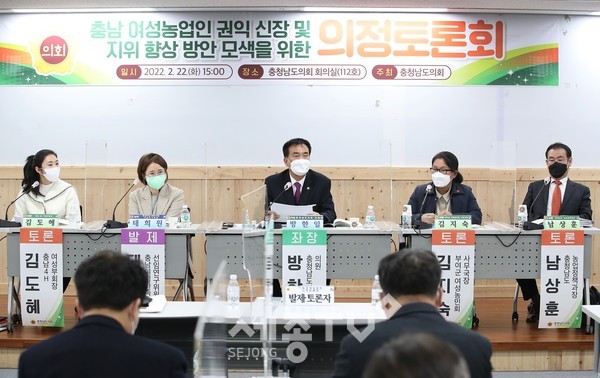 도의회는 22일 ‘충남 여성농업인 권익신장 및 지위향상 방안 모색을 위한 의정토론회’를 도의회 소회의실에서 개최했다. 여성농업인에 대한 종합대책 방안을 모색하기 위해 여성농업인, 농업인단체, 유관기관 관계자 등 30여 명이 참석했다.