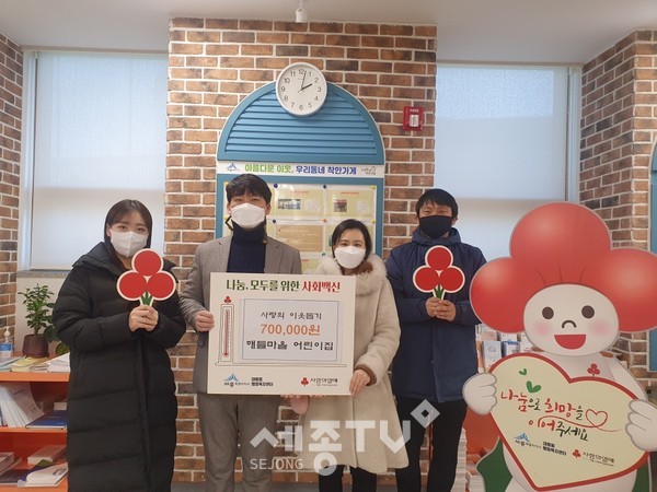 세종특별자치시 대평동(동장 차하철)에 위치한 중부대학교 위탁 해들마을 어린이집(원장 최윤정)이 24일 대평동 행정복지센터를 찾아 어려운 이웃을 위해 써달라며 성금 70만 원을 기탁했다.