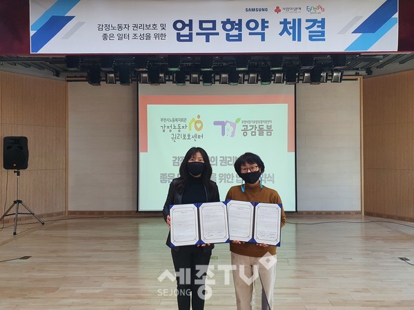 협약식에 참석한 이영주 센터장은 “부천시노동복지회관과의 연계사업을 통해 감정노동자인 장기요양요원이 안전한 노동환경에서 건강한 돌봄노동을 실천할 수 있기를 바라고 나아가 우리 사회에서 돌봄종사자의 권익보호를 위한 공감대가 확산되기를 바란다”고 말했다.