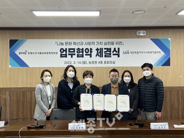 세종특별자치시사회복지협의회(회장 김부유, 이하 ‘협의회’)와 농림수산식품교육문화정보원(원장, 이종순, 이하 ‘농정원’)은 14일 지역사회복지 발전 및 사회적 가치 실현에 기여하고자 업무협약을 체결했다.