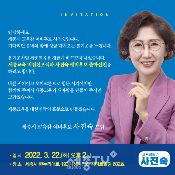 사진숙 세종교육감 예비후보가 오는 3월 22일 오후 2시 나성동 예비후보 사무실에서 출마기자회견을 겸한 비전 선포식을 진행할 예정이다.