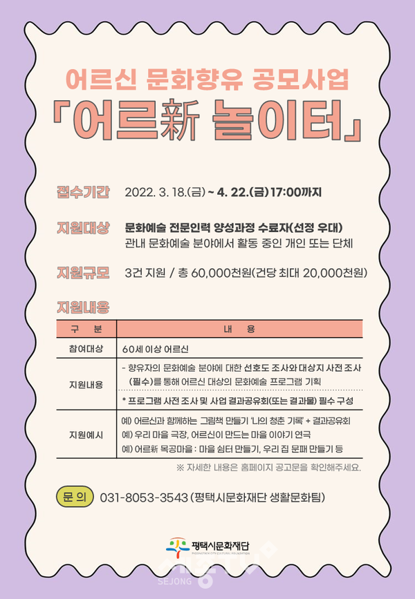 재단법인 평택시문화재단(대표이사 이상균)은 어르신의 문화향유 기회 확대를 위한 신규 공모사업 「어르新 놀이터」를 진행한다고 밝혔다.