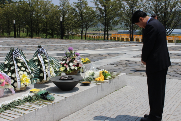 참배 후 이 후보는 방명록에 ‘또다시 5월, 세종시는 노무현입니다. 대통령님의 뜻을 되살려 사람사는 도시 행복도시 세종 만들겠습니다. 지방선거 승리로 증명해보이겠습니다’라고 적었다.