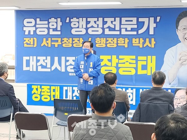 장종태 예비후보는 인사말을 통해 “”중기부 세종 이전, K-바이오 랩허브 유치 실패 등 많은 분이 대전이 위기라 말한다”며 “대전의 희망을 찾기 위해 ‘대전경제 대전환’으로 획기적 변화를 이끌겠다”고 강조했다.