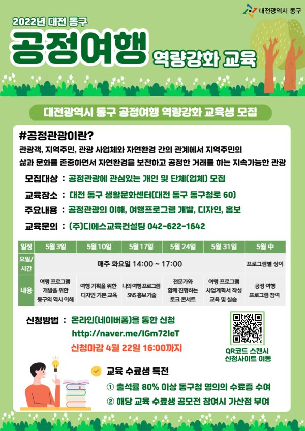 대전 동구(구청장 황인호)는 동구지역 공정관광 활성화 및 다양한 관광 콘텐츠 발굴을 위한 ‘공정관광 기획자 역량강화 교육프로그램’ 교육생을 모집한다.다고 밝혔다.
