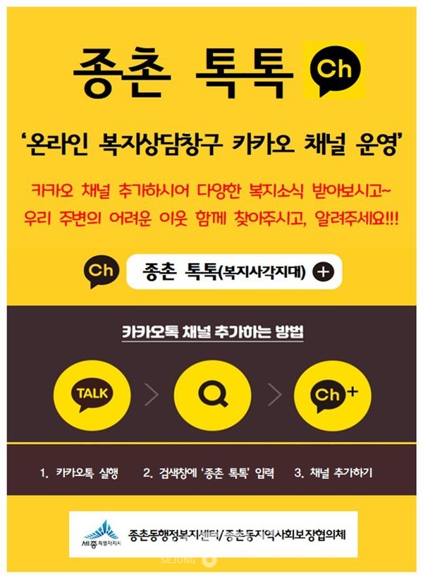 세종특별자치시 종촌동지역사회보장협의체(위원장 박미애·박재희)가 쌍방향 온라인 소통창구인 ‘종촌 톡톡(복지사각지대)’ 복지채널을 운영한다고 11일 밝혔다.