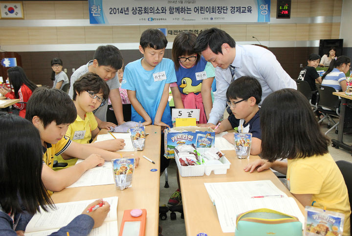 ▲ 대전상공회의소가 23일 오후 1시 대회의실에서 개최한 '2014년 상공회의소와 함께하는 어린이회장단 경제교육'에 참가한 강사와 어린이들이 수업을 진행하고 있다. (사진제공=대전상의)