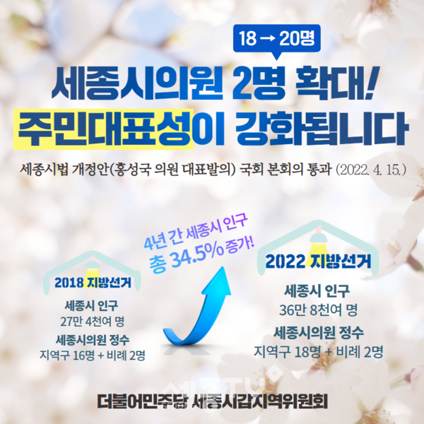 15일, 더불어민주당 홍성국 의원이 대표발의한 세종시법 일부개정법률안 수정안이 국회 본회의를 통과했다. 이로써 세종시의회 지역구 의원 정수는 16명에서 18명으로 확대됐다. 비례대표 의원 정수는 기존 2명 그대로 유지된다. 오는 6월 지방선거부터 개정안이 적용될 예정이다.
