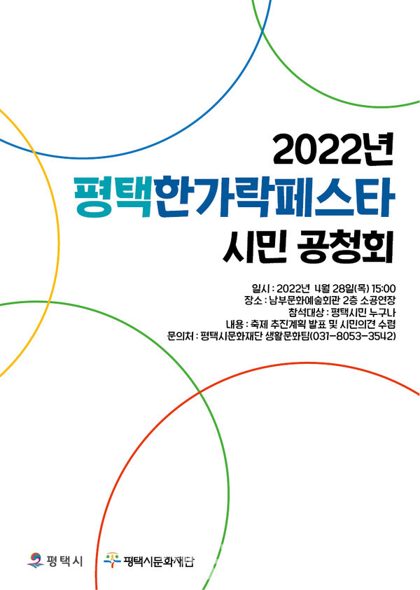 재단법인 평택시문화재단(대표이사 이상균)은 오는 4월 28일(목) 15시부터, 남부문화예술회관 2층 소공연장에서 <2022년 평택한가락페스타 시민 공청회>를 개최한다고 밝혔다.