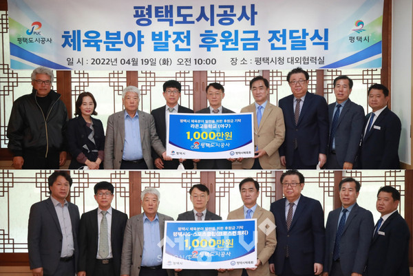 평택도시공사(사장 김재수)는 19일 평택시청 대외협력실에서 평택시 체육분야 발전 및 선수 육성을 위한 후원금 총 2,000만원을 기탁했다.