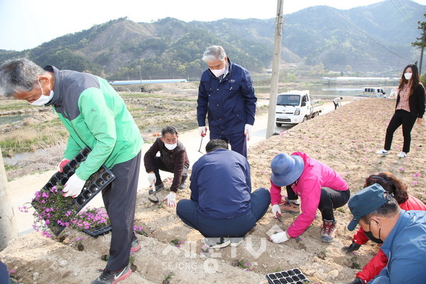 금산군 남일면주민자치위원회(위원장 김민수)는 지난 19일 봉황천 산책로에 꽃잔디 2000본을 식재했다.